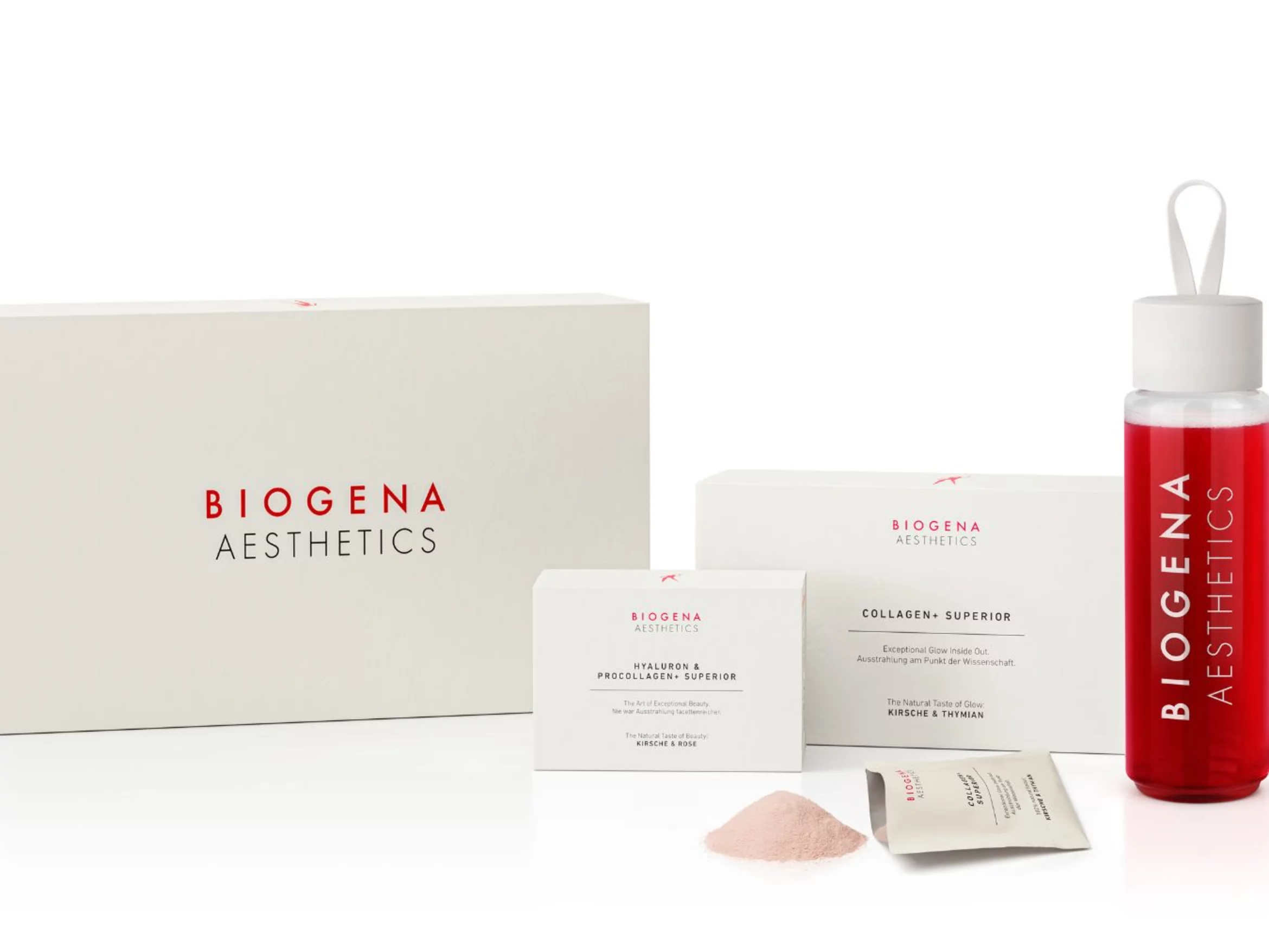 Luksuslikus kinkekarbis on Biogena Collagen+ Superior ning Hyaluron & Procollagen+ Superior portsionipakikesed, millest jätkub 21ks päevaks ning spetsiaalne pudel joogi nautimiseks.